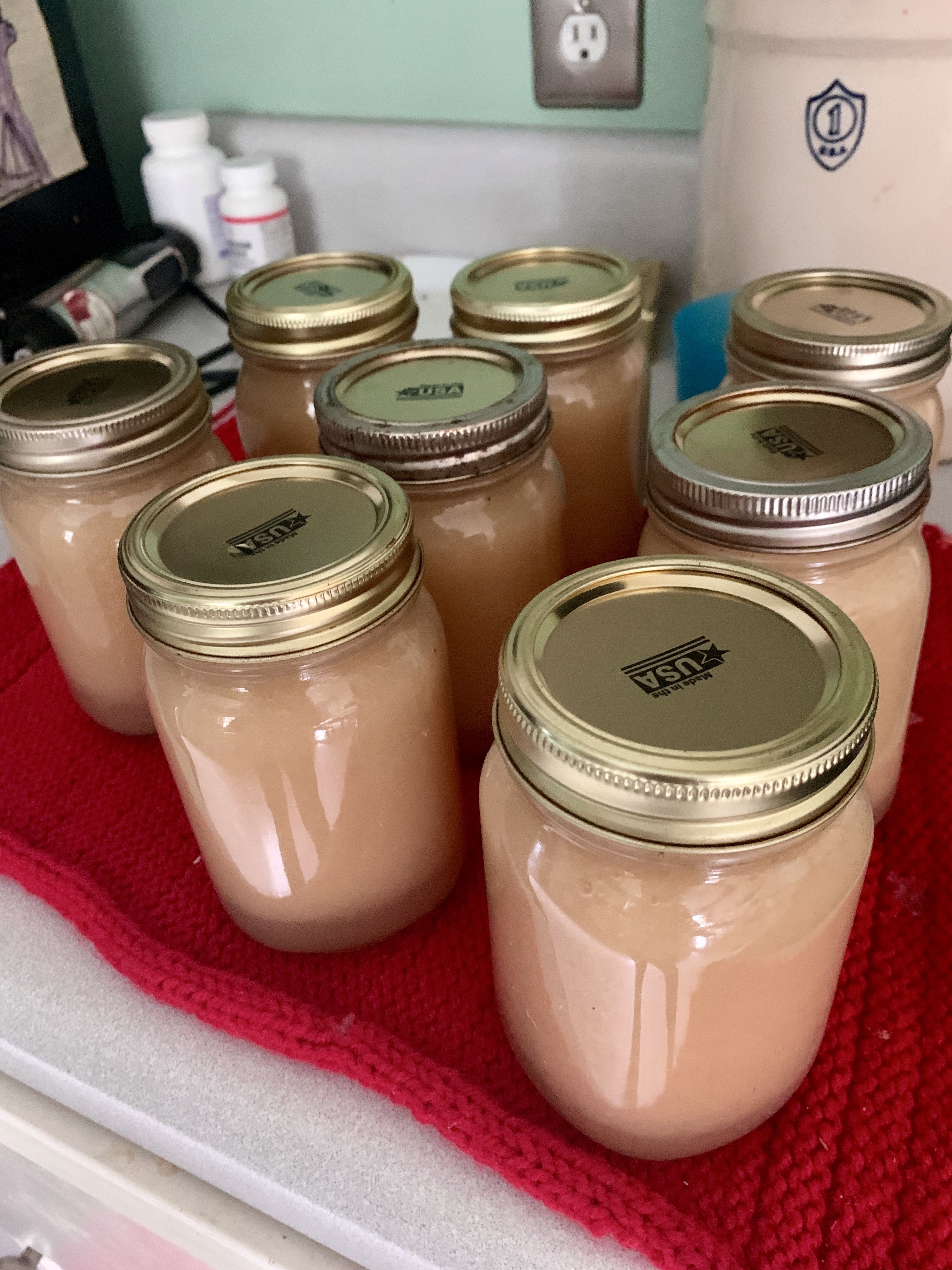 These varieties were the easiest to peel and pit out of any we’ve ever had. To get the peels off of 2 and a half bushels I got good at an assembly line. An assistant may have been recruited. First peaches go into a pot of boiling water for a minute or two. Then into an ice bath. After that the peels slip right off and I cut them in half to get the pit. The stick blender turns them into goo, if I need goo.