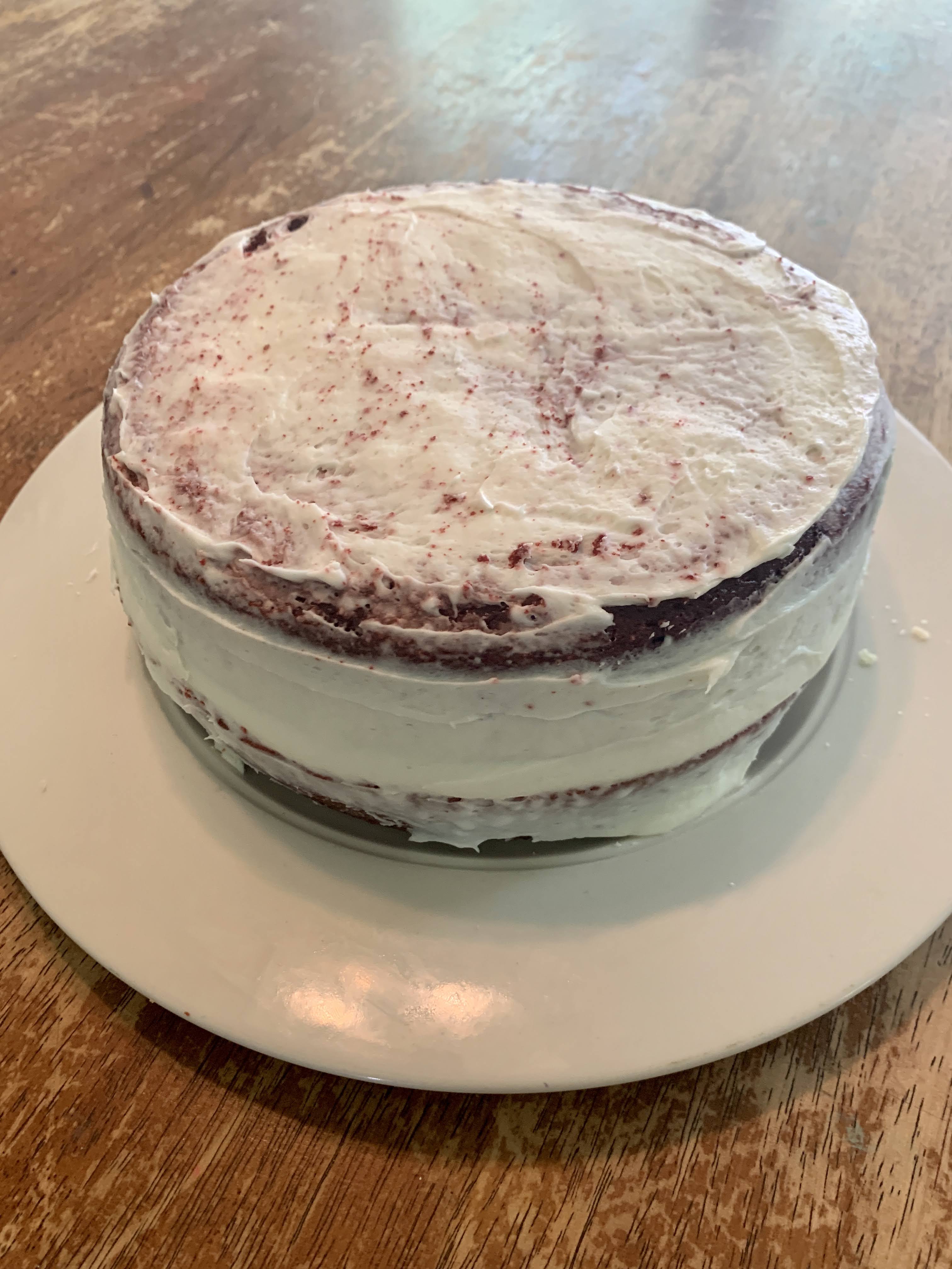 Red Velvet cake (from a box because I just don’t want to mess with that much red food coloring), cream cheese frosting filling and American buttercream because I just wasn’t up to dealing with another failed batch of Swiss Meringue buttercream. The ombre effect didn’t work the way that I wanted, but birthday girl was thrilled. My little sous chef squad did a great job with the stars.