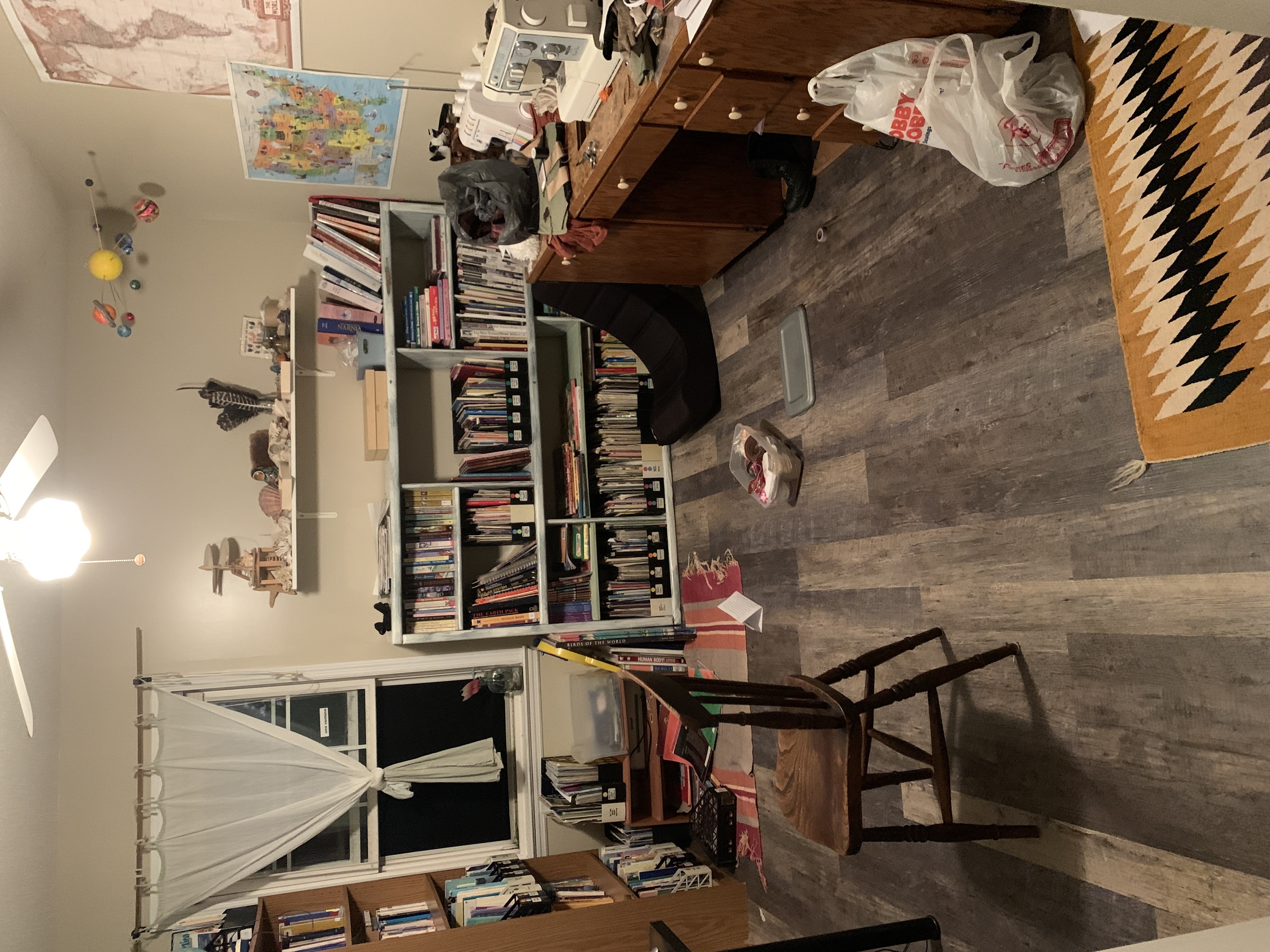 It was as I was sitting here typing that I realized that I didn’t have an after picture for the school room. So I rushed over and just took some. The lighting is horrible and the room is not very neat, but the floor is great! Look at the floor and the lovely green walls!