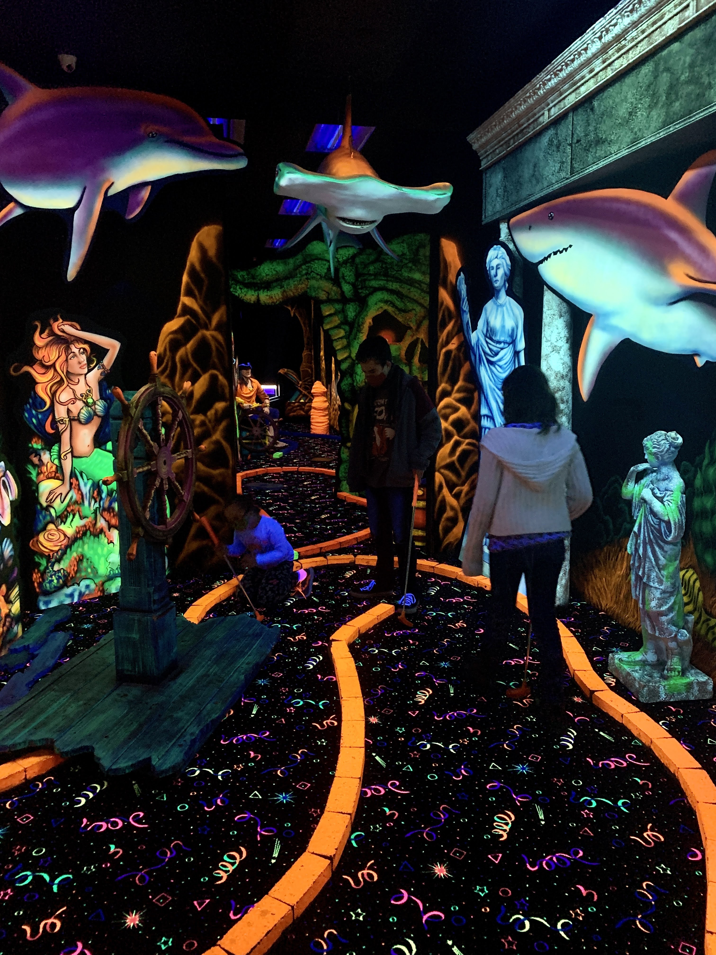 The course we wanted to go to was closed because it was really cold and it was an outside course. Luckily there was a black light indoor course next door that was perfect…pirate themed in case you couldn’t tell. I didn’t get whacked in the face like the first time I took my kids mini-golfing, so right off the bat we were doing awesome. (The kids were tiny and it was at one of our favorite places in Las Vegas that had a mini golf traveling exhibit. I was helping Garyn or Naomi and caught a club to the bone just above my eye. I did not cry in front of the kindly docent. Barely).