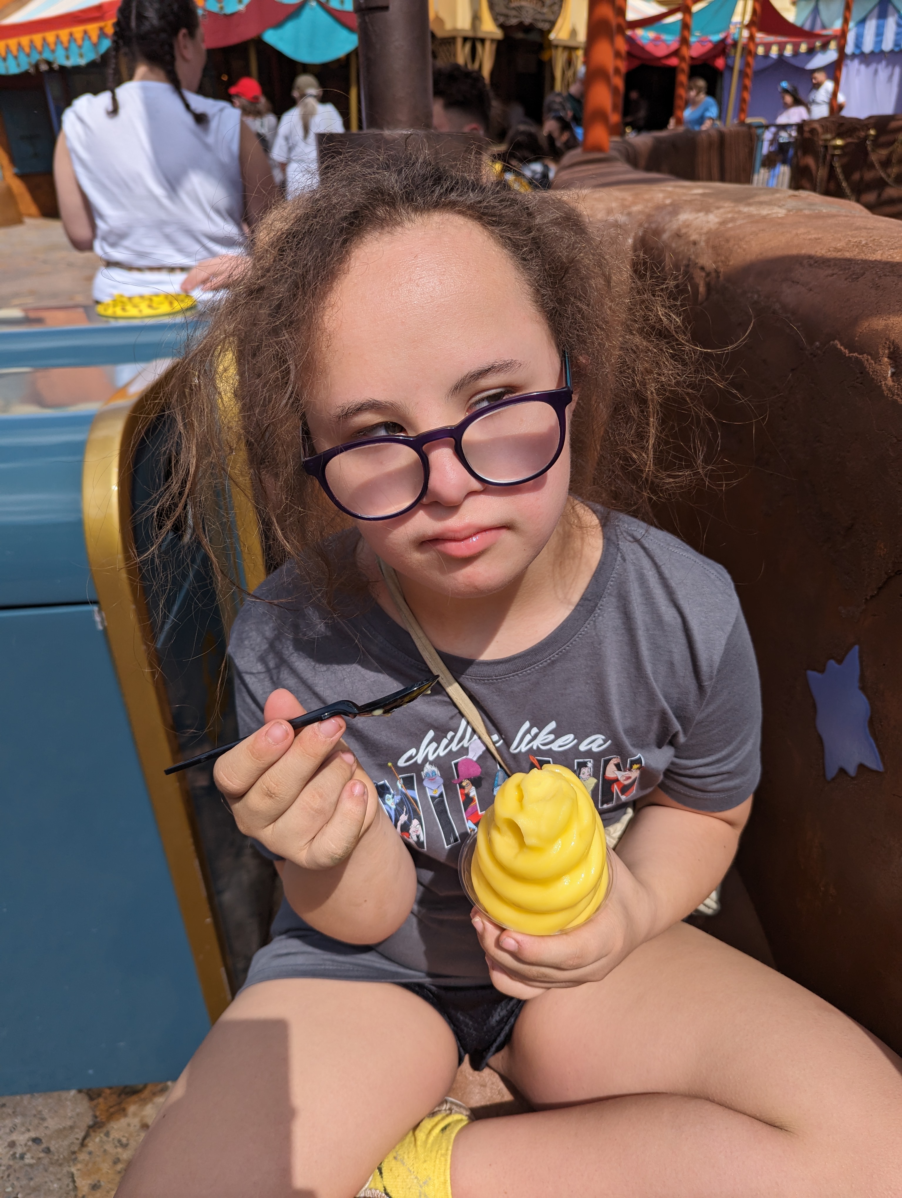 Day 2 Magic Kingdom. There was a master list with all the rides she wanted to do at each park and the places she wanted to eat. Reality turned out a bit differently each day, but she was thrilled at the end of each day so who even cares? They rode Tron: Light Cycle and it was one of her favorite rides of the trip, tater tots for lunch and had a dole whip which she loved (don’t let her face fool you). They did a lot of rides and ended the day when she was done. Layna ended up loving movies and swimming at the hotel every bit as much as the theme parks.