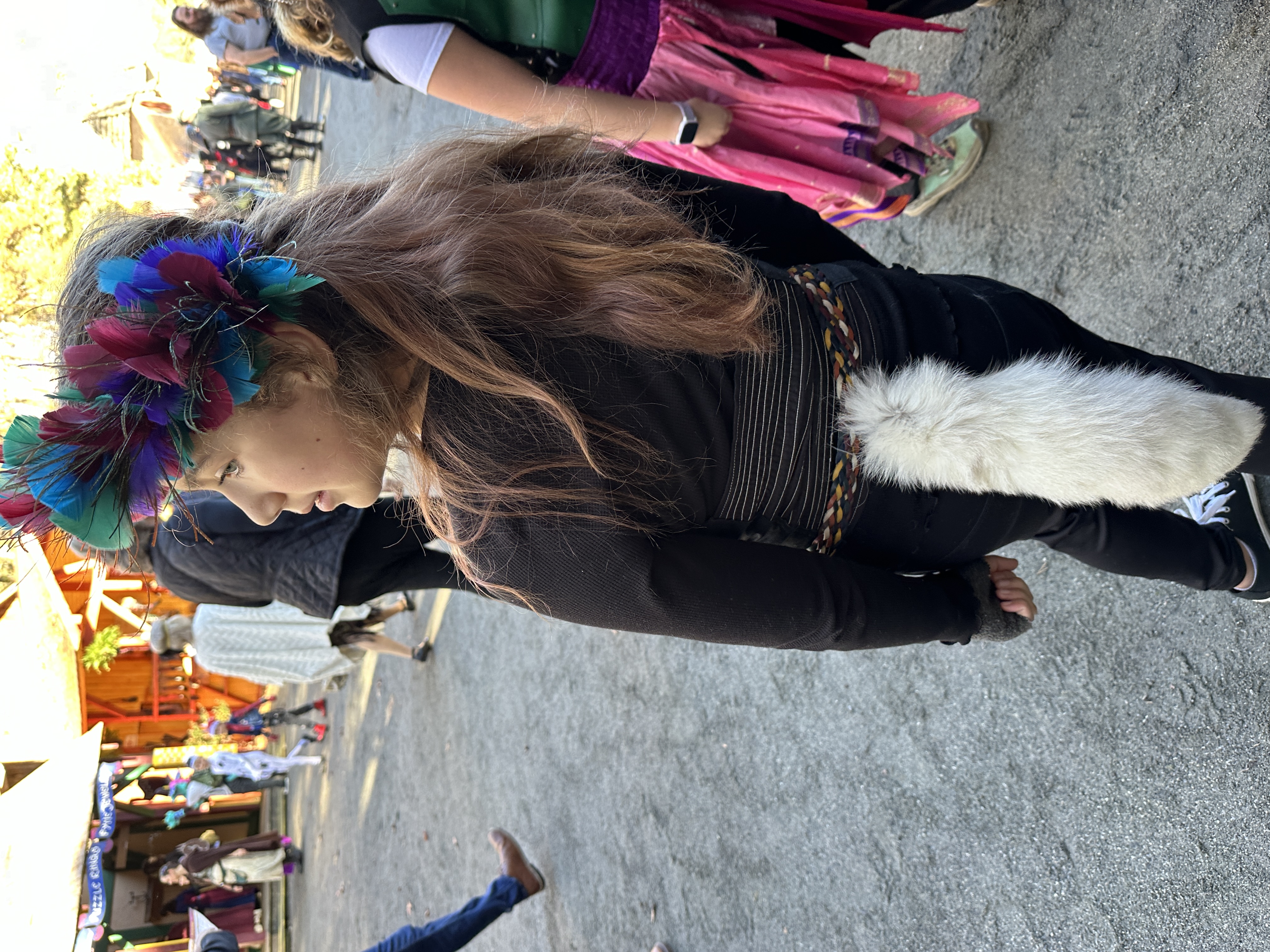 We broke tradition and were well rewarded. Usually I’ve scheduled out Ren Faire days early to mid October. This time we went on the second to last weekend of the whole faire…mid November. It also was the “Any Fandom is allowed” weekend. I saw a guy with Down Syndrome dressed in command gold from Star Trek. We saw various and sundry Star Wars characters and at least 4 different Doctors (from Doctor Who). Anime furries, Orcs from Middle Earth, and of course, the usual Renaissance Faire usual suspects. The costumes were top notch and the people were even more fun to interact with. It’s our new favorite and the plan for next year. The weather was also absolutely perfect…just this side of chilly. Layna’s polar bear hoodie was just right. Corra opted to not wear her furry pants but left with a new tail. Naomi was stunning in her gold horns and wings. She even had someone ask for a picture with her. She got so many compliments and she said it may have been the best Ren Faire ever. Being asked to play the dragon in the aerial silks show we watched definitely helped. We skipped jousting and no one was sad because we saw all of our other favorites including Romeo the diva owl. I got my usual ornament, a beautiful fire inspired addition. Layna and Corra ended the day painting with the Paint Fairy and saying “Hello” to the mermaids, while Naomi bought a parasol and a hand-made leather bag.